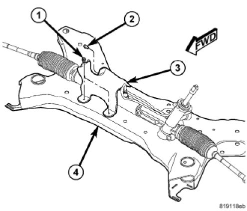NOTE: When installing the front suspension crossmember (1) back in the vehicle, it is very important that the crossmember be attached to the body in exactly the same spot as when it was removed. Otherwise, the vehicle's wheel alignment settings (caster and camber) will be lost.