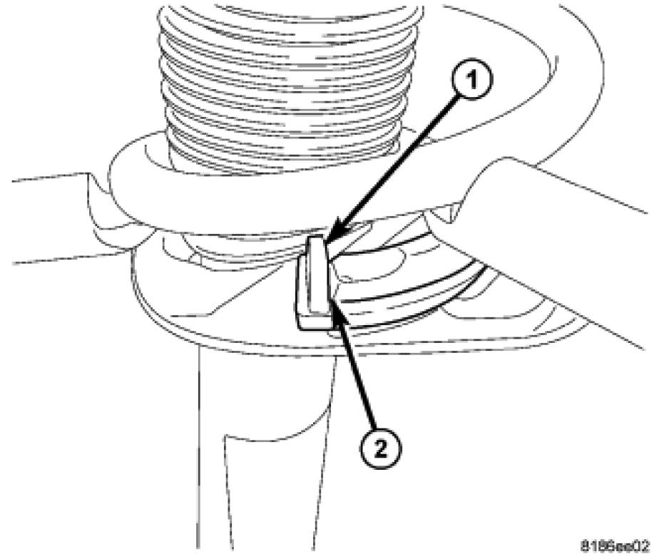 7. Install the strut up through the bottom of the coil spring and upper spring seat, mount, and bearing until the lower spring seat contacts the lower end of the coil spring. Rotate the strut as necessary until the end of the bottom coil (2) comes in contact with the stop (1) built into the lower spring isolator.
