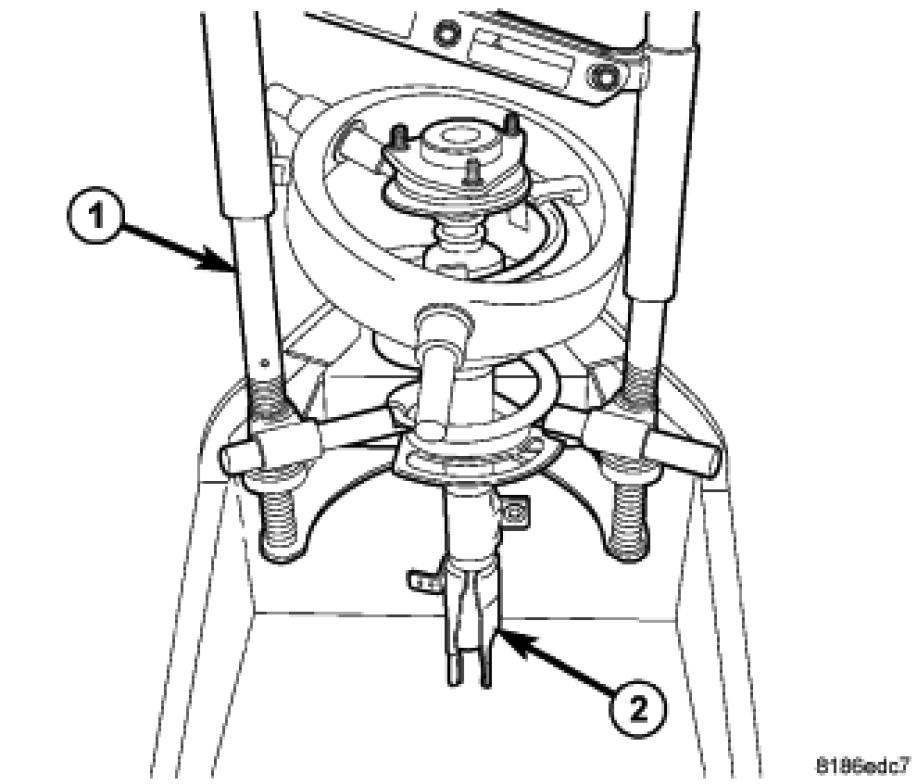 2. Position the strut assembly (2) in the strut coil spring compressor (1) following the manufacturer's instructions and set the lower and upper hooks of the compressor on the coil spring. Position the strut clevis bracket (2) straight outward, away from the compressor.