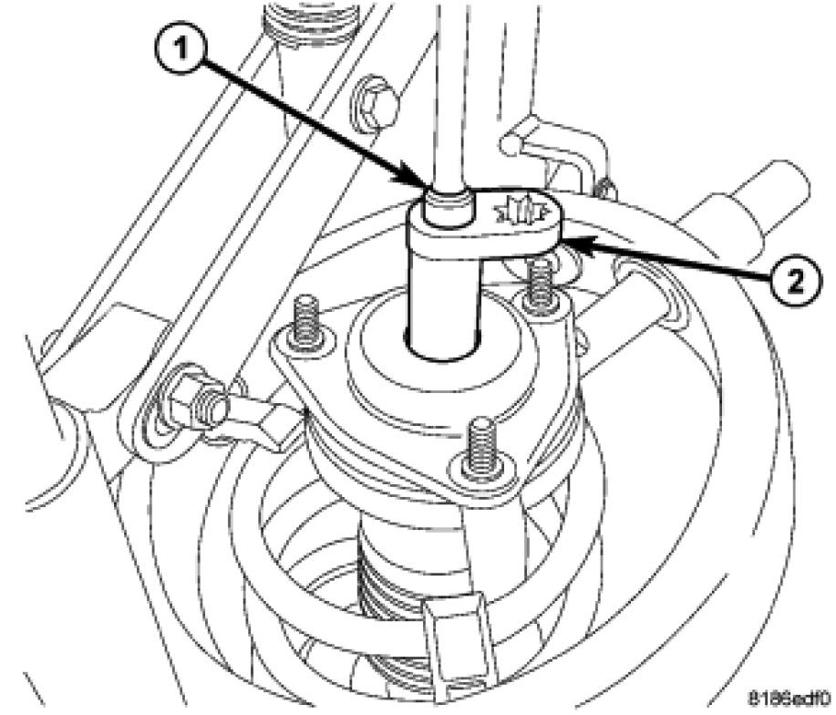 4. Once the spring is sufficiently compressed, install Strut Nut Wrench (2), Special Tool 9362, on the strut rod nut. Next, install Strut Shaft Socket (1), Special Tool 9894, on the end of the strut rod. While holding the strut rod from turning, remove the nut using the strut nut wrench.