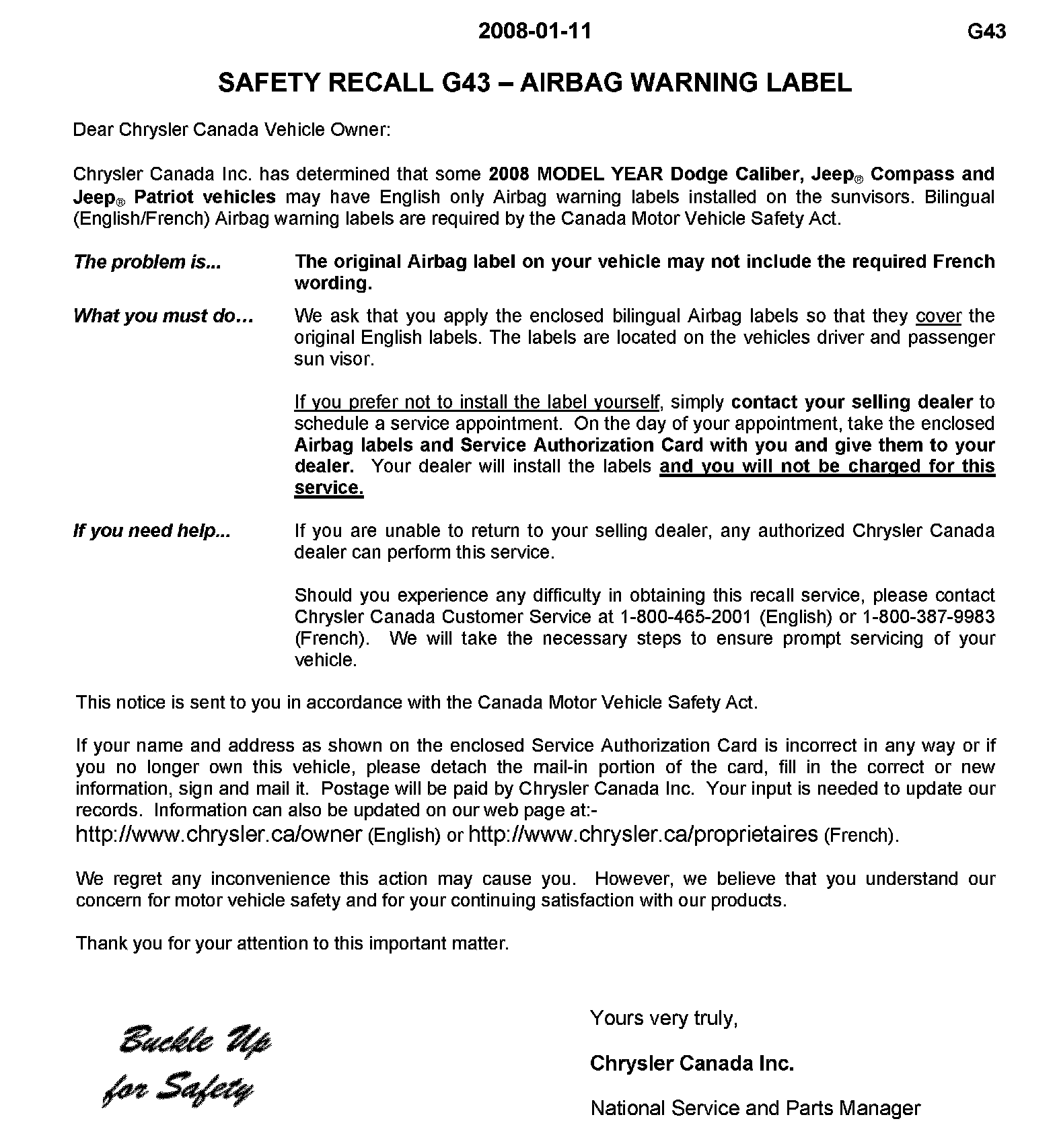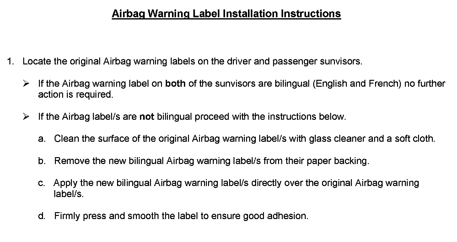 Recall - Air Bag Label Replacement (Canadian Vehicles)