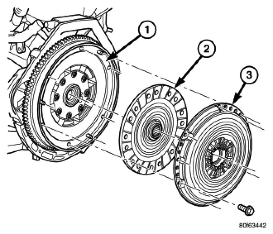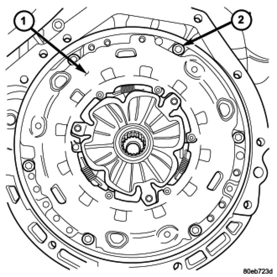 7. Install the clutch pressure plate (1) to the flywheel and clutch disc. Finger tighten the six pressure plate-to-flywheel bolts.