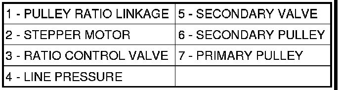 The pulley ratio linkage moves to the left direction of the stepper motor. The line pressure circuit opens due to the movement of the ratio control valve which links to the pulley linkage, and line pressure is applied to the primary pulley.