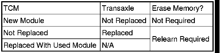 NOTE: Refer to the following table when the Transmission Control Module (TCM) and/or transaxle has been replaced to determine if the TCM memory must be erased.