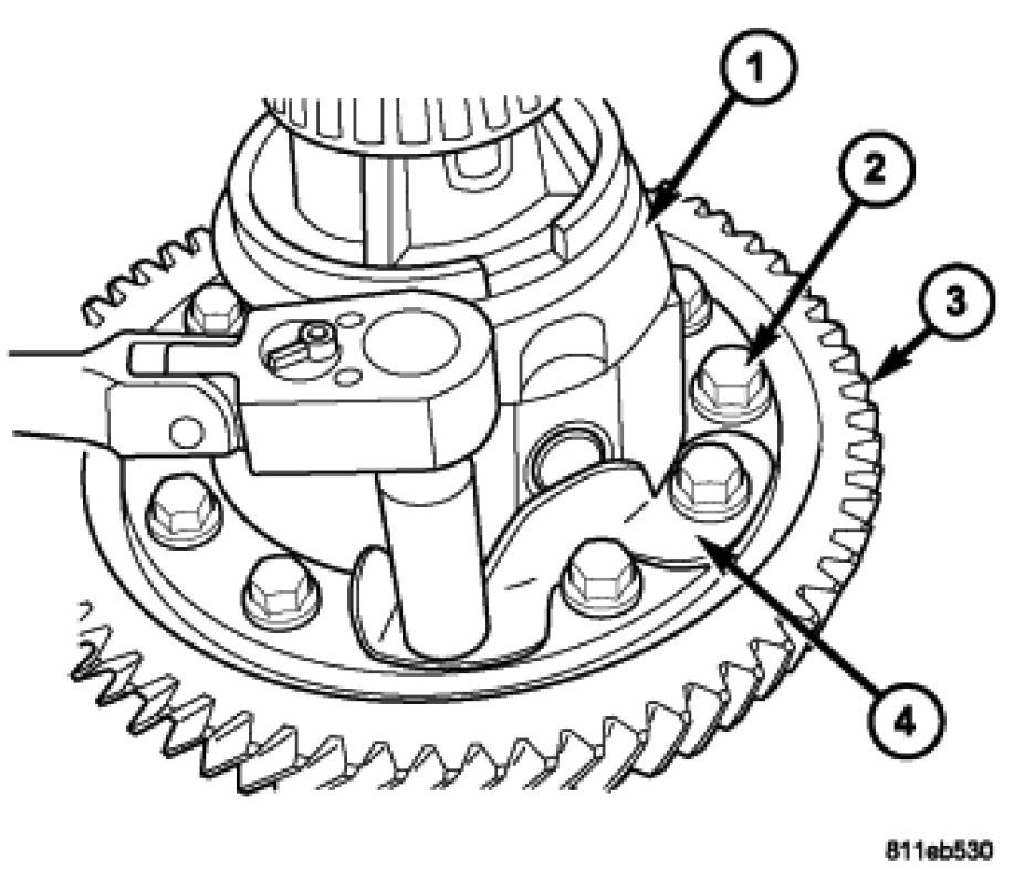 7. Install pinion shaft retainer along with NEW ring gear-to-case bolts (2) tighten bolts to 95 Nm (70 ft. lbs.).