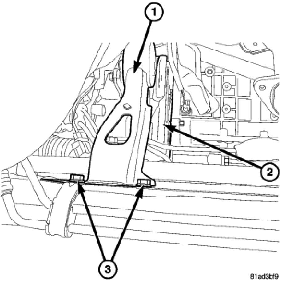 5. Install the rear transmission mount bracket (2) and bolts, tighten to 68 Nm (50 ft. lbs.).