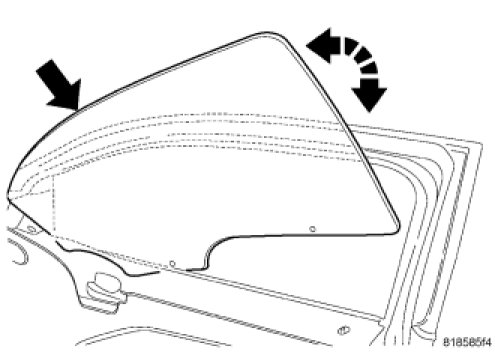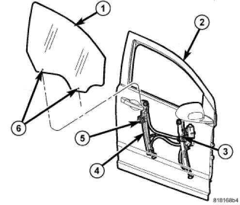 2. Slide glass (1) down into the door (2) and connect the mounting holes (6) to the regulator lift plates (3) and (5).