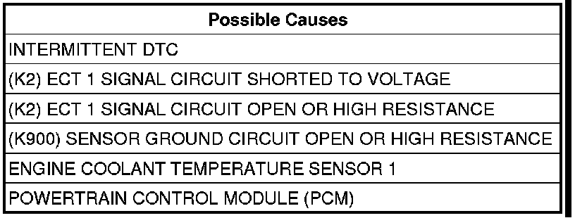 - Repair the (K2) ECT 1 Signal circuit for a short to voltage.