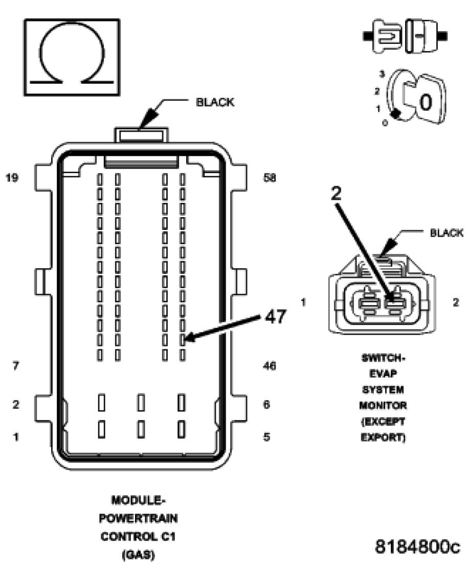 Using the wiring diagram/schematic as a guide, inspect the wiring and connectors between the Evaporative System Monitor Switch and the Powertrain Control Module (PCM).