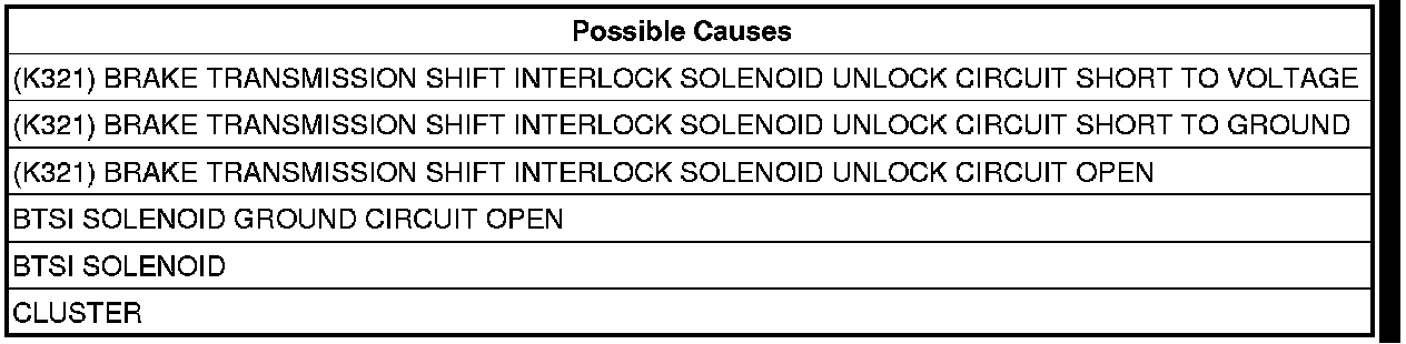 - Repair the (K321) Brake Transmission Shift Interlock Solenoid Unlock circuit for a short to voltage.