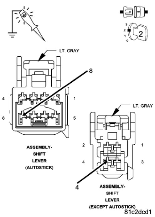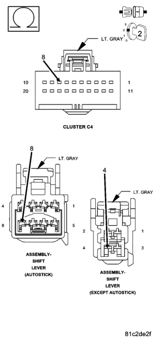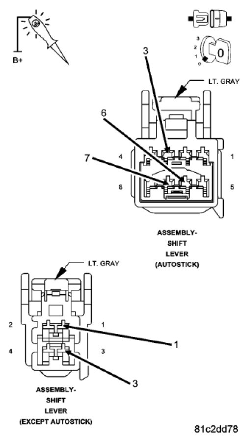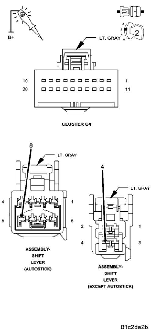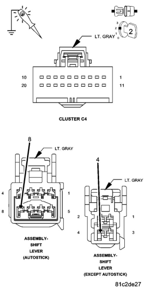 Using a test light connected to B+. Measure the resistance between ground and the Ground circuits in the Shift Lever Assembly harness connector.