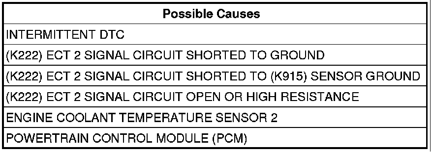 - Repair the (K222) ECT 2 Signal circuit for a short to the (K915) Sensor Ground circuit.