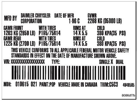 A vehicle certification label is attached to every DaimlerChrysler Corporation vehicle. The label certifies that the vehicle conforms to all applicable Federal Motor Vehicle Standards. The label also lists: