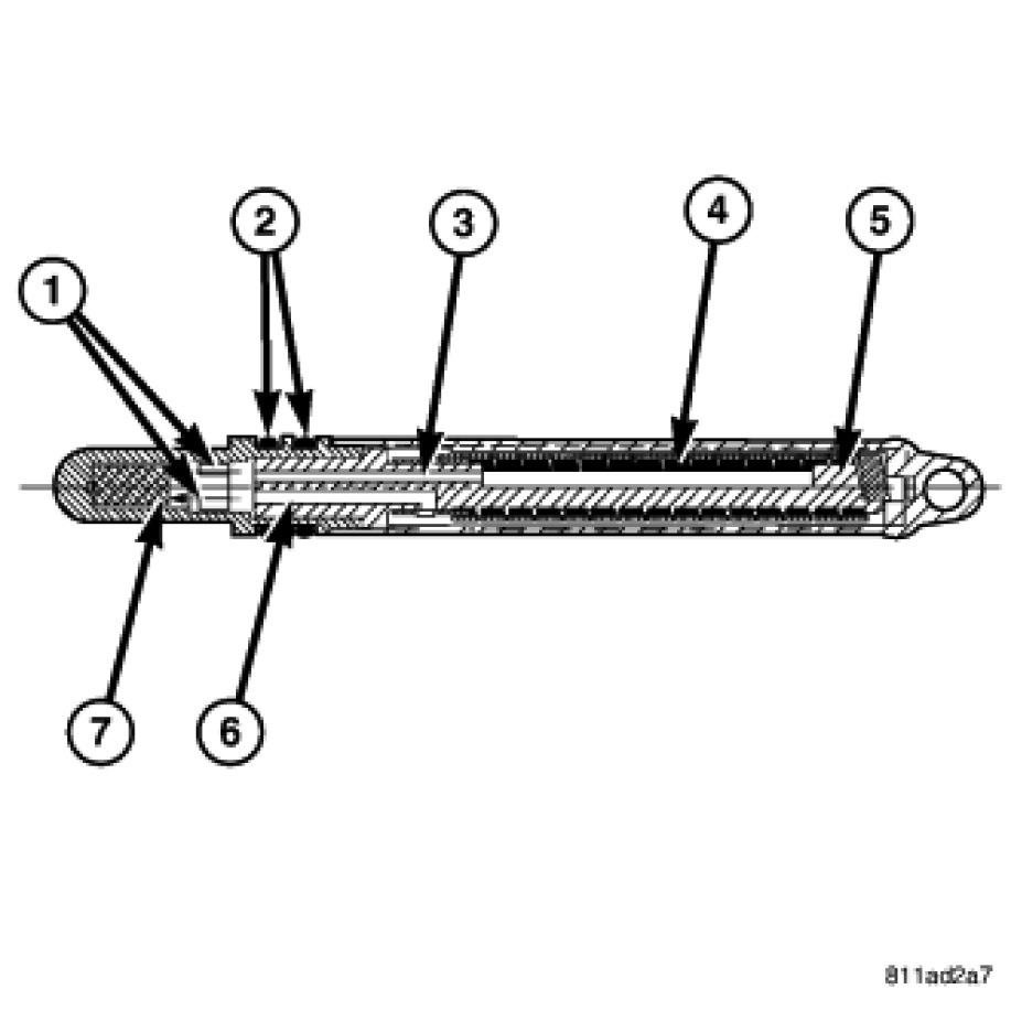 The variable A/C orifice tube consists of the inlet filter screen (5), the bi-metal coil (4), the fixed port (3), the variable port (6), metering orifices (1), a nylon mesh diffuser screen (7) and two rubber O-rings (2) which seal the tube to the inside of the A/C liquid line to prevent refrigerant from bypassing the metering orifices.