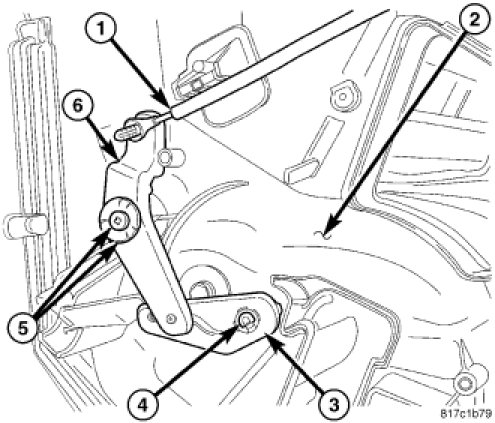 6. Remove the screw and washer (5) that secures the blend door cable lever (6) to the air distribution housing and remove the cable lever.