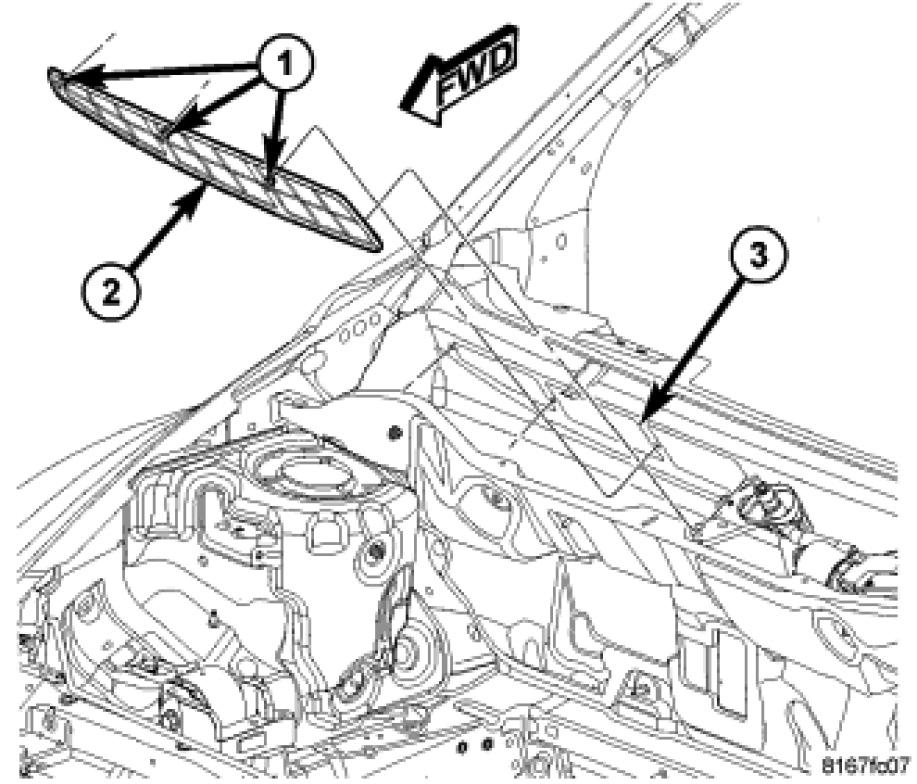 1. Position the HVAC housing air inlet screen (2) to the cowl panel (3) and fully engage the three push-in retainers (1) that secure the screen to the panel.