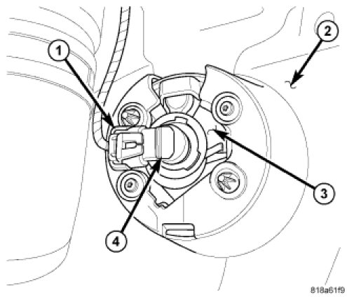 8. From behind the front fascia (2) disconnect the engine compartment wire harness connector (1) from the front fog lamp bulb (4) connector receptacle.