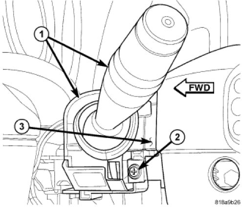 3. Install and tighten the screw (2) that secures the mounting tab on the front of the left multi-function switch to the mounting bracket on the clockspring. Tighten the screw to 1 Nm (10 in. lbs.).