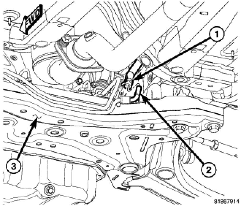 11. 2.4L Engine with All-Wheel-Drive - Position the pressure hose routing clamp (2) at the exhaust manifold and install the mounting bolt (1). Tighten the bolt to 9 Nm (80 in. lbs.).