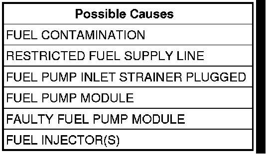 Remove the Fuel Pump Module and Fuel Tank Module (if equipped), inspect the Fuel Pump Inlet and the bottom of the fuel tank for debris that could cause the fuel pump inlet to be plugged.