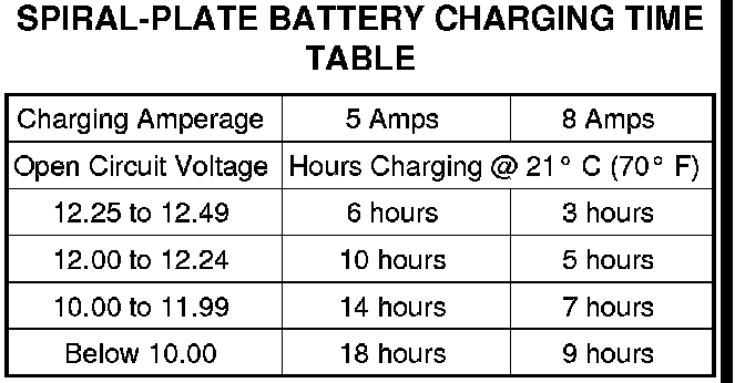 The Battery Charging Time Table gives an indication of the time required to charge a typical battery at room temperature based upon the battery state-of-charge and the charger capacity.