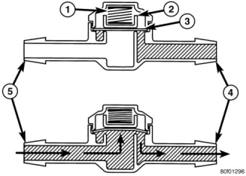 The rear check valve provides more than one function in this application. It prevents washer fluid from draining out of the rear washer supply hoses back to the washer reservoir. This drain-back would result in a lengthy delay from when the rear washer switch is actuated until washer fluid was dispensed through the rear washer nozzle, because the washer pump would have to refill the rear washer plumbing from the reservoir to the nozzle. Such a drain-back condition could also result in water, dirt, or other outside contaminants being siphoned into the washer system through the washer nozzle orifice. This water could subsequently freeze and plug the nozzle, while other contaminants could interfere with proper nozzle operation and cause improper nozzle spray patterns. In addition, the rear check valve prevents washer fluid from siphoning out through the rear washer nozzle after the rear washer system is turned OFF.