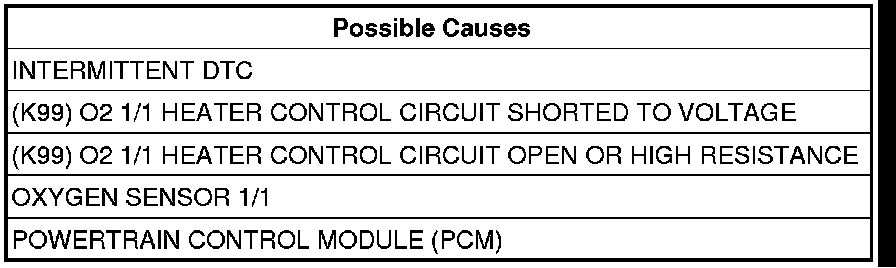 - Repair the (K99) O2 1/1 Heater Control circuit for a short to voltage.