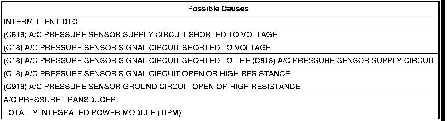 - Repair the (C18) A/C Pressure Sensor Signal circuit for a short to the (C818) A/C Pressure Sensor Supply circuit.