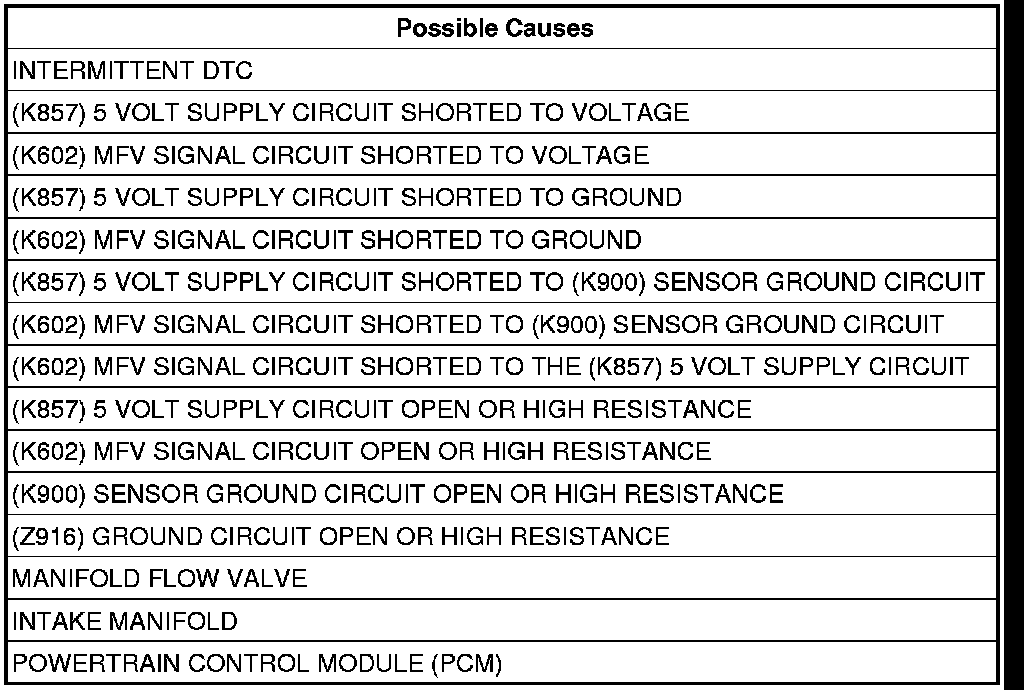 - Repair the (K602) MFV Signal circuit for a short to the (K900) Sensor Ground circuit.