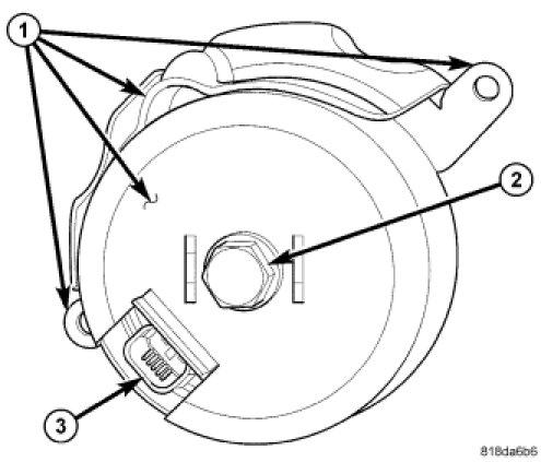 The alarm siren module consists of microprocessor-based electronic control circuitry, the siren, and a nickel metal hydride backup battery. All of the alarm module components are protected and sealed within a molded plastic housing. An integral connector receptacle (3) extends from the housing and connects the unit to the vehicle electrical system through a dedicated take out and connector of the engine compartment wire harness. The housing also has a threaded insert within a mounting hole through which a screw (2) secures it to a bell shaped stamped metal mounting bracket (1). The siren and bracket unit are located on the outboard side of the right front fender load path beam where it is concealed by the right front fender above the wheel house splash shield. Two screws and U-nuts secure the mounting bracket to the vehicle.