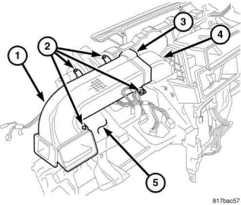 1. Position the driver side instrument panel duct and demister duct assembly (1) onto the top of the instrument panel support (5).