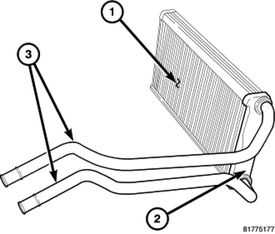 The heater core (1) for the heating-A/C system is mounted within the HVAC air distribution housing, which is located behind the instrument panel. The heater core is a heat exchanger made of rows of tubes with fins and is positioned within the air distribution housing so that only the selected amount of air entering the housing passes through the heater core before it is distributed through the heating-A/C system ducts and outlets. One end of the heater core is fitted with a tank (2) that includes the fittings for the heater core tubes (3).