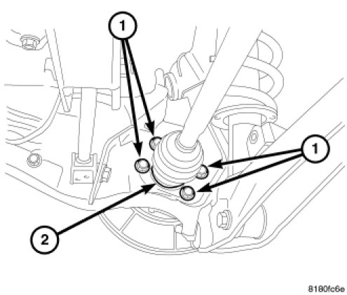 2. Install the four bolts (1) securing the hub and bearing (2) to the trailing link. Tighten the bolts to 105 Nm (77 ft. lbs.).