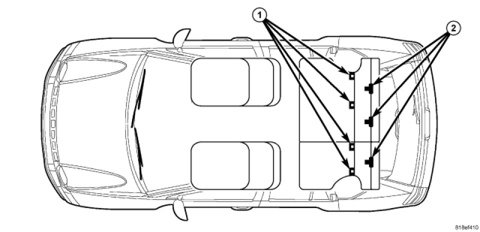 The upper tether anchors (1) are each integral to the second row seat back panels. These anchors are each constructed from short lengths of heavy-gauge steel wire that is securely welded into stamped steel cups that are integral to the seat back panels. There is a separate molded plastic trim bezel (2) located around each of these anchors. The child restraint upper tether anchors cannot be adjusted or repaired and, if ineffective or damaged, they must be replaced as a unit with their respective second row seat back panels.