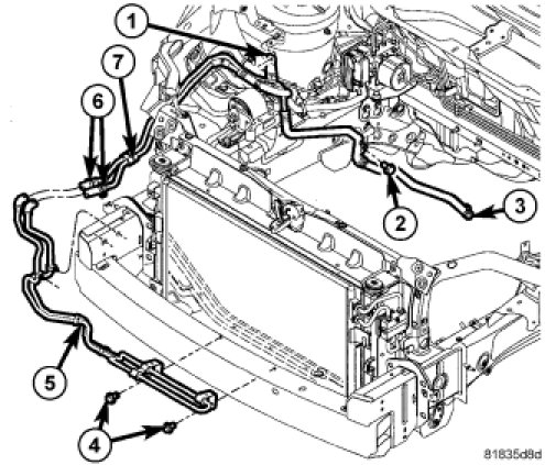 3. Install the fluid return hose (7) on the power steering fluid cooler lines (5). Install the hose clamp (6) on the hose past the bead formed into the end of the cooler tube and secure in place.