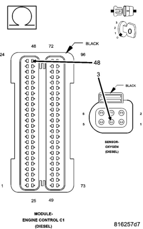 Using the wiring diagram/schematic as a guide, inspect the wiring and connectors between the Oxygen Sensor and the Engine Control Module (ECM).