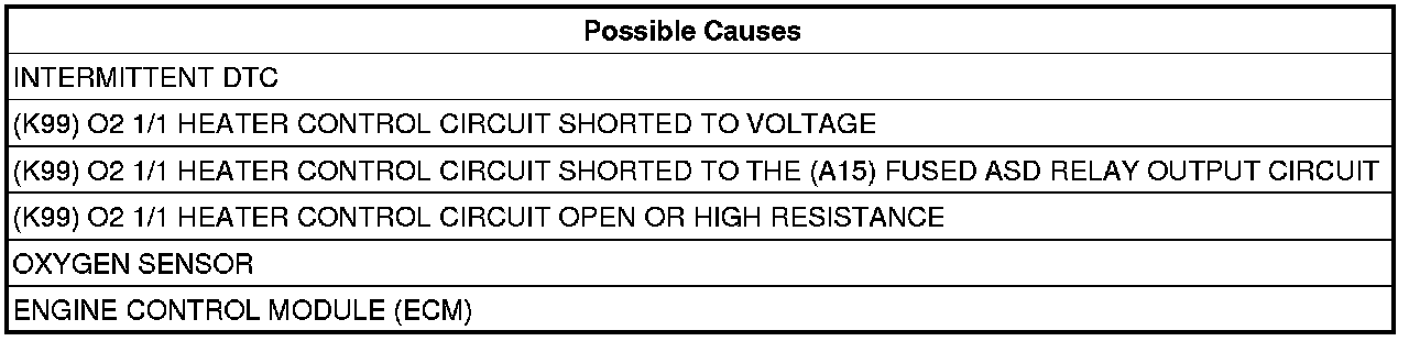- Repair the (K99) O2 1/1 Heater Control circuit for a short to the (A15) Fused ASD Relay Output circuit.