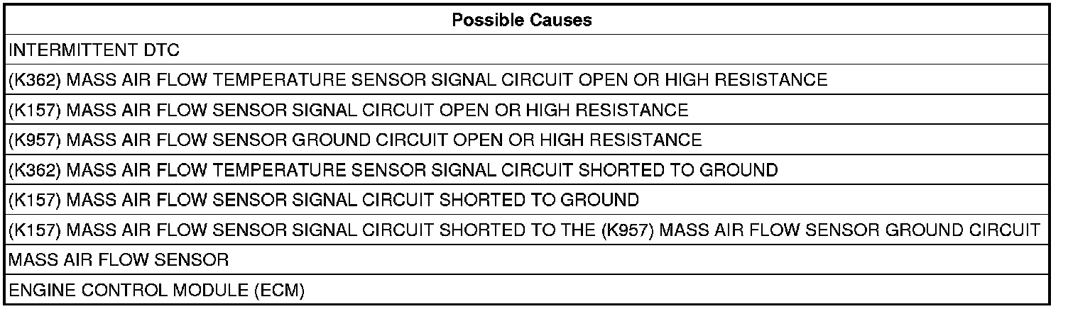 The ECM detects that the (K157) Mass Air Flow Sensor Signal circuit or the (K362) Mass Air Flow Temperature Sensor Signal circuit is shorted to ground.