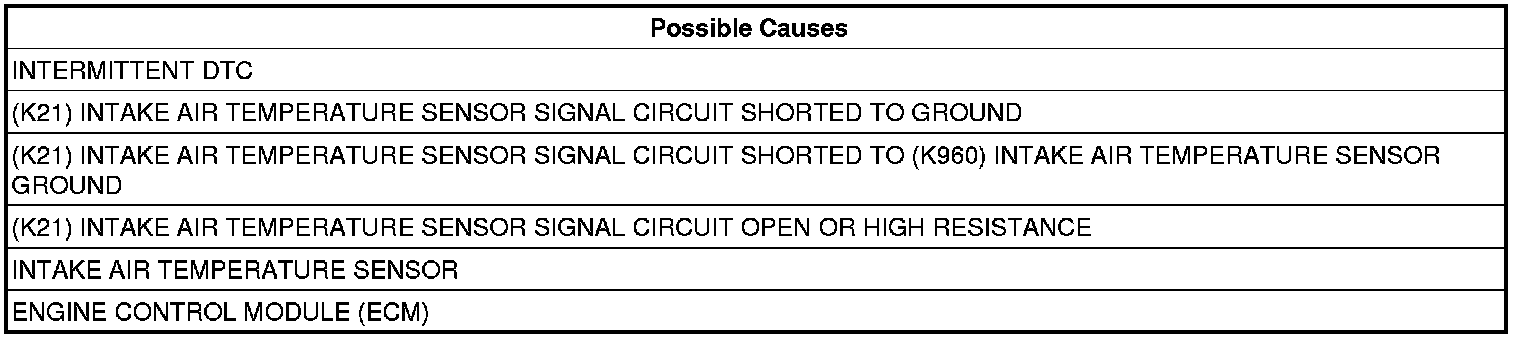 - Repair the (K21) Intake Air Temperature Sensor Signal circuit for a short to the (K960) Intake Air Temperature Sensor Ground circuit.