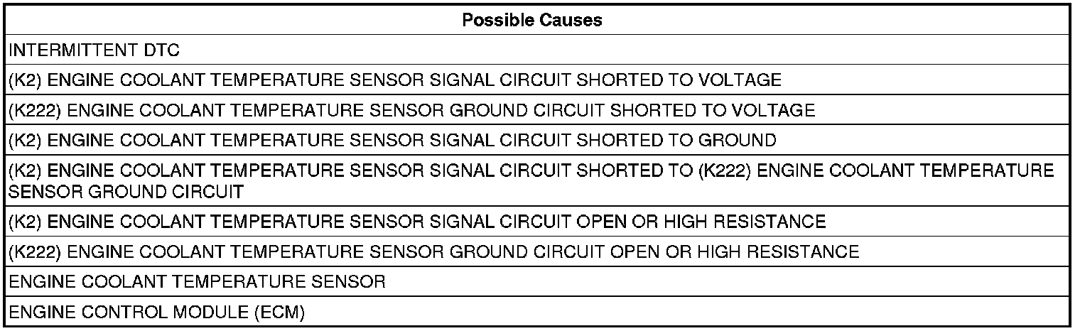 - Repair the (K2) Engine Coolant Temperature Sensor Signal circuit for a short to the (K222) Engine Coolant Temperature Sensor Ground circuit.