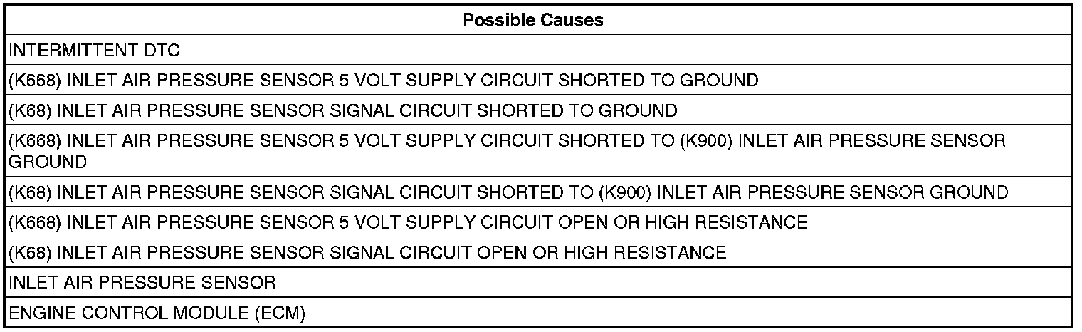 - Repair the (K668) Inlet Air Pressure Sensor 5 Volt Supply circuit for a short to the (K900) Inlet Air Pressure Sensor Ground circuit.