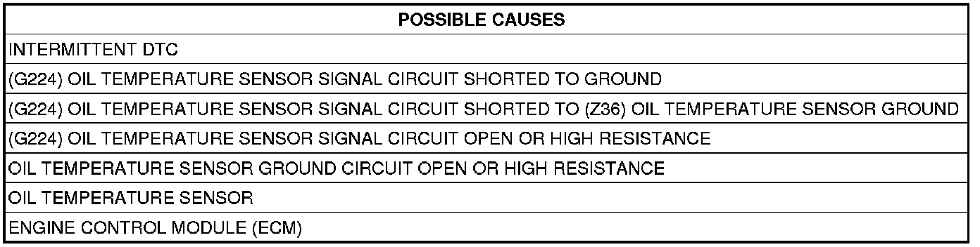- Repair the (G224) Oil Temperature Sensor Signal circuit for a short to the (Z36) Oil Temperature Sensor Ground circuit.