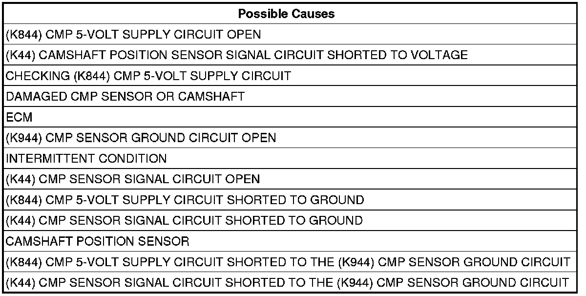 - Repair the (K844) CMP Sensor 5-Volt Supply circuit for a short to ground.