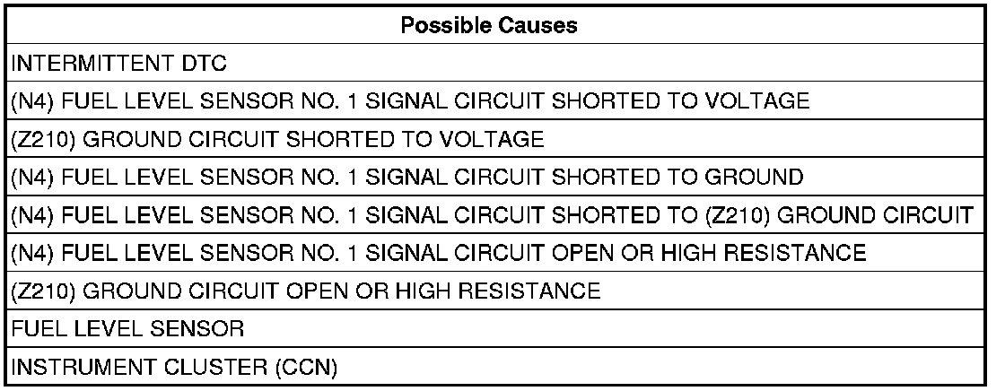 - Repair the (N4) Fuel Level Sensor No. 1 Signal circuit for a short to the (Z210) Ground circuit.