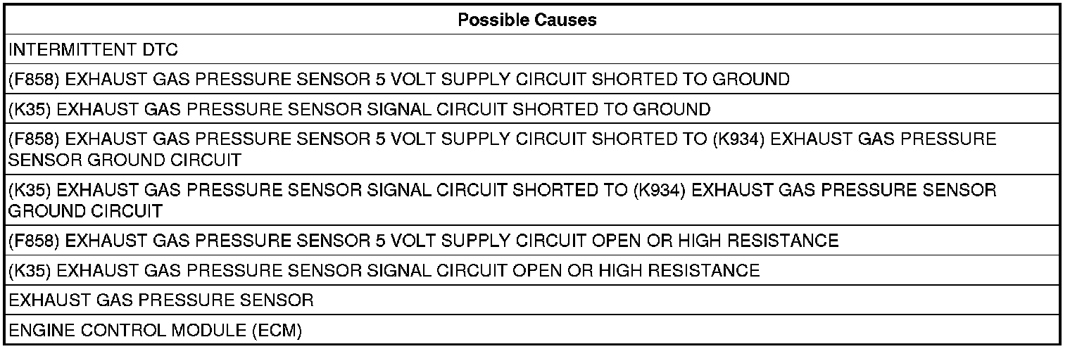 - Repair the (F858) Exhaust Gas Pressure Sensor 5 Volt Supply circuit for a short to the (K934) Exhaust Gas Pressure Sensor Ground circuit.