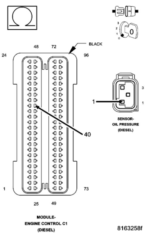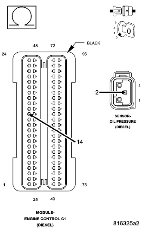 Using the wiring diagram/schematic as a guide, inspect the wiring and connectors between the Oil Pressure Sensor and the Engine Control Module (ECM).