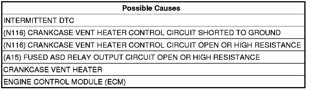 - Repair the (N116) Crankcase Vent Heater Control circuit for an open circuit or high resistance.