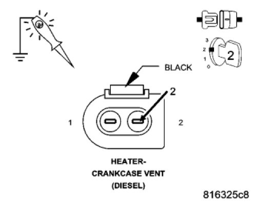 Using a 12 volt test light connected to 12 volts, check the (N116) Crankcase Vent Heater Control circuit in the Crankcase Vent Heater harness connector.
