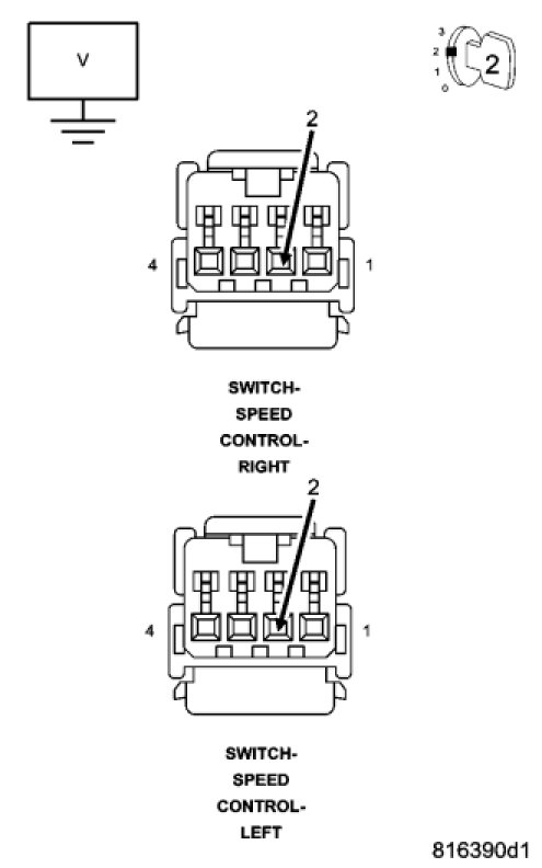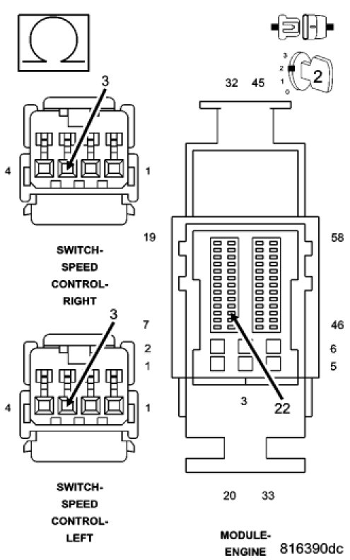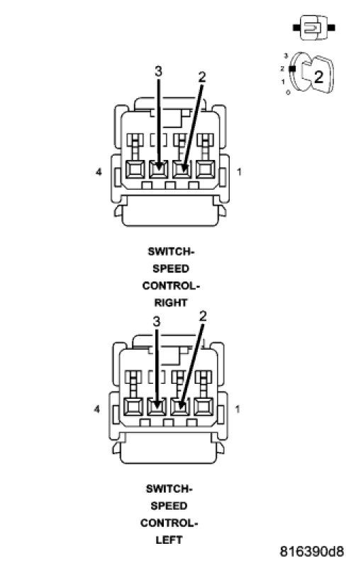 Using the wiring diagram/schematic as a guide, inspect the wiring and connectors between the Speed Control Switch and the Engine Control Module (ECM).