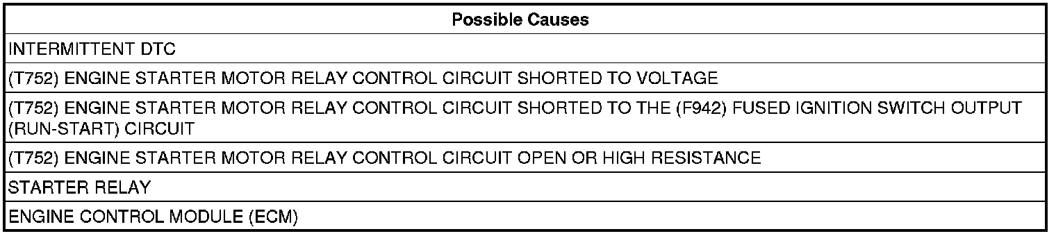 - Repair the (T752) Engine Starter Motor Relay Control circuit for a short to the (F942) Fused Ignition Switch Output (Run-Start) circuit.
